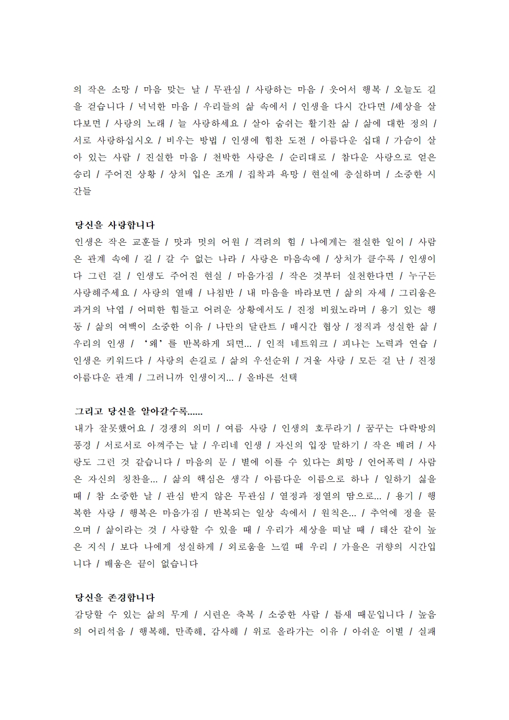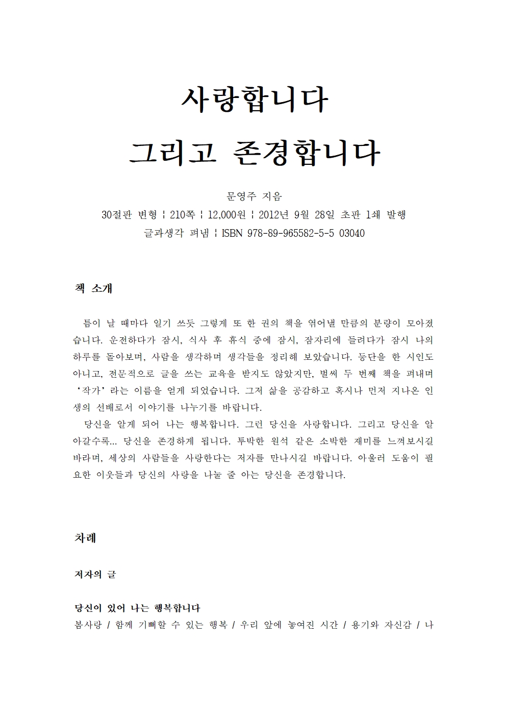 보도자료 사랑합니다. 그리고 존경합니다. 2012. 문영주. (03040) by <辛禧宙> 2021. 3. 2. 공유하기 게시글 관리 글과생각 관련글 어린이 이짱. 2012. 김동석. (73510) 시선: 어느 혼혈아의 마지막 하루. 2012. 양성관. (03330) 스테가노 그래피: 숨겨진 메시지. 2012. 김주원. (03560) 내 인생에 멘토가 되어 준 한마디. 2012. 양광모. (03040) 댓글