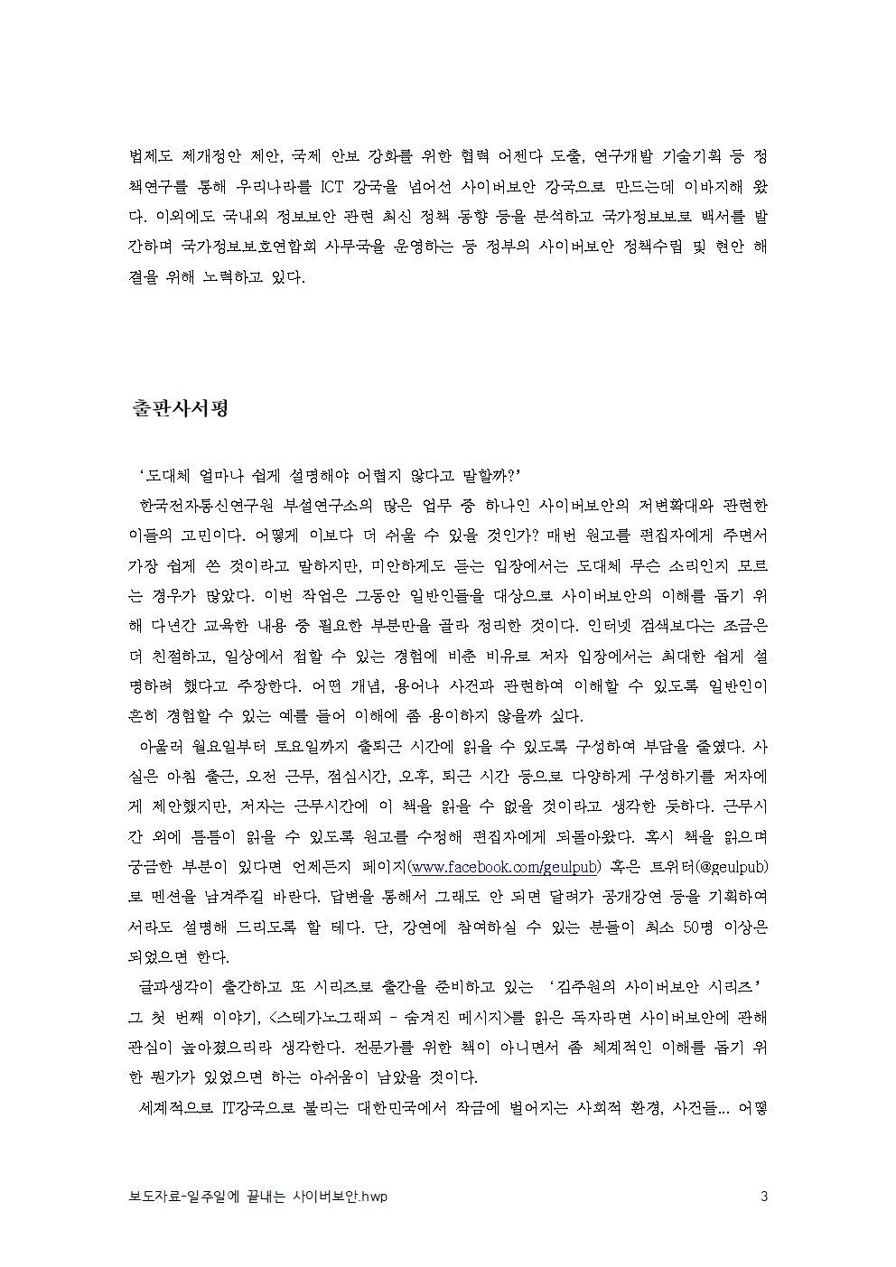 보도자료 일주일에 끝내는 사이버 보안: 하루 1시간만 투자하세요. 그러면 당신도 사이버보안전문가가 됩니다. 2012. 김인중;한국전자통신연구원 부설연구소. (03560) <辛禧宙> 2021. 3. 2. 21:10